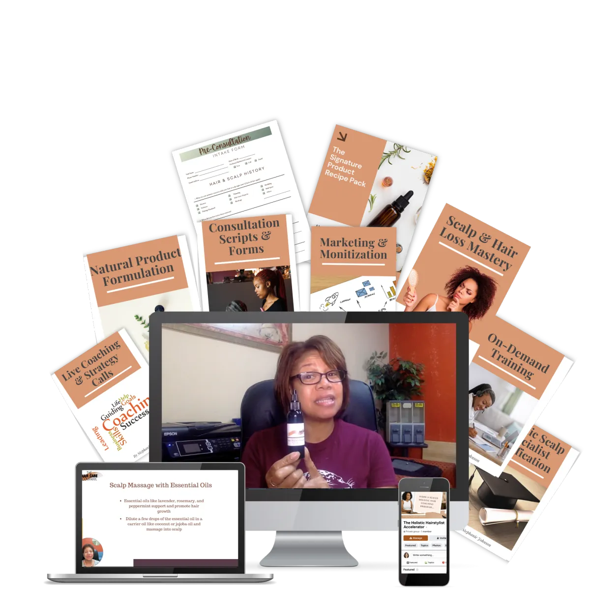 The Holistic Hairstylist Accelerator is more than just a certification — it’s your all-in-one roadmap to becoming the go-to expert for hair loss, scalp issues, and custom product creation. This 6-week program was designed specifically for hair care professionals who are ready to stand out, make a bigger impact, and build new income streams through holistic hair care. You’ll learn how to treat thinning hair and scalp disorders naturally–and how to formulate and launch your own line of all-natural products you clients will love (and keep buying).